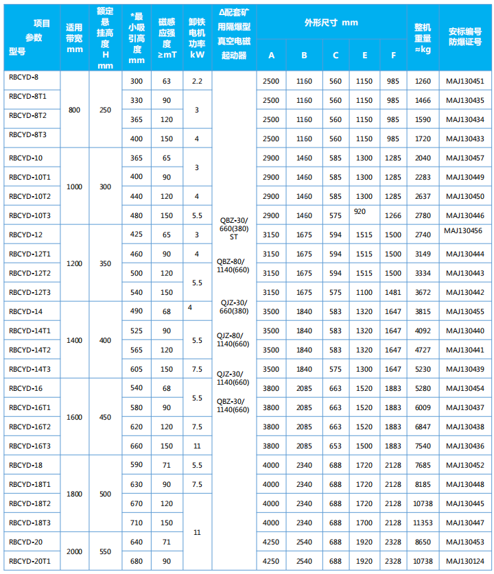 四、RBCYD系列隔爆型永磁除鐵器主要技術參數、外形尺寸 執行標準:GB3836-2010、Q/321191ACL002