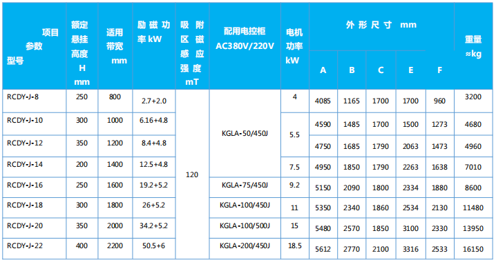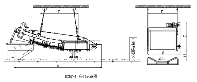 四、RCDY-J系列懸掛式組合回收型除鐵器主要技術參數(shù)、外形尺寸 執(zhí)行標準:JB/T7689、JB/T10885